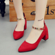 2016秋季新款尖头中跟单鞋绒面粗跟单鞋红色婚鞋浅口一字扣女鞋