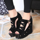 2017夏季新款鱼嘴坡跟防水台高跟罗马黑色凉鞋镂空绑带松糕凉鞋女