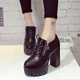 2016秋季新款圆头系带侧拉链粗跟高跟防水台高跟鞋复古黑色皮鞋女