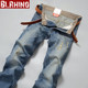 贝勒犀牛夏季新款修身直筒牛仔裤男装韩版破洞猫须青少年牛仔长裤