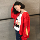 后背刺绣字母立领棒球服飞行员夹克宽松短款长袖春季红色短外套女