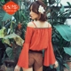 买2送1-迷阵原创夏装露肩性感宽松一字肩上衣印花荷叶边雪纺衫女