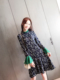 现货【张静芝】草绿花边领水袖风琴百褶碎花深蓝真丝连衣裙