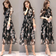 2017新款女装夏修身中长款连衣裙女黑色显瘦印花裙中袖雪纺长裙春