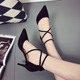 春夏新款韩版绒面一字扣高跟凉鞋女尖头细跟交叉绑带镂空中跟单鞋