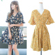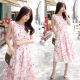 夏季新款v领喇叭袖印花收腰显瘦短袖中长款雪纺小碎花连衣裙子女