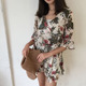 韩版夏季新款度假风花朵系带高腰显瘦V领喇叭袖雪纺连体裤短裤女