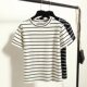 17夏季新款日系小清新黑白条纹圆领短袖T恤女宽松纯棉打底衫上衣