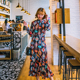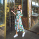 古拉良品新款雪纺连衣裙显瘦韩版V领宽松腰镂空拼接印花短袖长裙