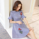 2017夏季新款一字肩短袖连衣裙女中长款韩版修身绣花条纹a字裙