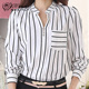 气质V领衬衫女长袖2017春装新款韩范宽松大码竖条纹白衬衣雪纺衫