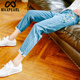 美帛2017春装新款刺绣牛仔裤女长裤宽松哈伦裤卷边浅色BF风直筒裤