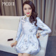 美地2017春秋新款女装连衣裙修身韩版印花裙长袖娃娃领A字裙气质