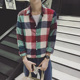 春夏薄款情侣装韩版修身格子学生七分袖衬衫百搭青年男士休闲衬衣
