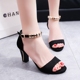 夏季新款细跟高跟鞋中跟凉鞋黑色绒面一字扣带性感露趾防水台女鞋