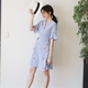 时尚起义韩国代购 可爱刺绣条纹V领系带收腰连衣裙女装 705640