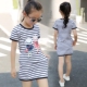 童装女童连衣裙夏装韩版2017新款纯棉儿童短袖条纹中长款T恤裙子