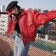 2017春装新品街头潮牌酒红色灯芯绒连帽廓形oversize卫衣金丝绒女
