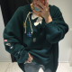 17春装韩新品百搭显瘦超级洋气个性大V领徽章破洞外套套头毛衣女