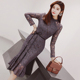 新款韩版中长款裙子长袖修身挂脖显瘦名媛蕾丝连衣裙2017春装
