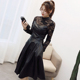 2016新款秋冬女装气质时尚韩版PU皮拼接修身显瘦黑色长袖连衣裙