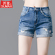 苏麦牛仔裤短裤女士夏装新款修身显瘦高腰卷边抓纹毛边磨破洞热裤
