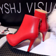 16秋冬欧美新款红色短靴尖头坡跟黑色女靴真皮高跟马丁靴裸靴女