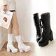 靴子女春秋冬季粗跟中靴高跟前系带马丁靴白色舞蹈加绒中筒靴学生