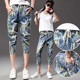 松紧腰薄牛仔裤女七分裤春夏宽松大码印花7分哈伦裤高腰显瘦马裤