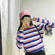 2016韩国秋季新款百搭宽松原宿bf学生蓝红拼色条纹长袖T恤上衣潮