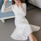 香步2017春秋新款韩版A字裙V领时尚修身白色百搭中长款蕾丝连衣裙
