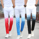 春夏新款2017渐变色潮流牛仔裤男士韩版个性破洞修身小脚白色长裤