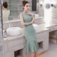2017新款女装荷叶边连衣裙夏中长款修身裙子薄荷绿圆领显瘦包臀裙