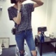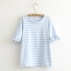 外贸原单 2016夏新款女装韩版圆领条纹拼接荷叶边袖口短袖T恤