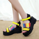 名典2016新款拼色凉鞋女夏季厚底防水台一字搭扣坡跟女鞋时尚潮鞋