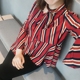 2017春装新款宽松雪纺条纹V领衬衫女 夏季女装韩版系带喇叭袖上衣