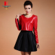 女士新品中长款弹力印花真皮拼接袖子连衣裙旗袍立领打底皮衣外套