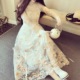 2017新款仙女气质透视网纱拼接立体蝴蝶刺绣系带收腰中长款连衣裙