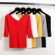 秋季韩版纯色冰丝V领中袖针织衫女五分袖薄款套头修身打底衫上衣