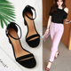 夏季中跟绒面罗马一字扣露趾凉鞋女简约气质优雅粗跟显脚小金属扣