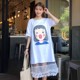 韩版女装中长款印花T恤网纱拼接连衣裙假两件套夏新款短袖裙子女