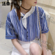 【法单SS】蓝色竖条纹衬衫女夏S家2017新款 娃娃领短袖衬衣宽松