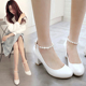 春季圆头粗跟中跟单鞋女高跟鞋一字扣带伴娘鞋红色婚鞋大码40-43