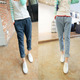 2017春夏新款韩版深浅两色哈伦牛仔裤女休闲长裤松紧腰宽松