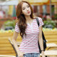 夏装新款 纯棉v领条纹女装韩版大码女士上衣短袖t恤女海魂打底衫