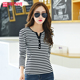 2015秋冬上衣加厚保暖修身打底衫V领大码纯棉条纹长袖t恤女