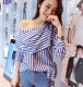 2017女装不规则荡领蓝色竖条纹露肩性感休闲百搭直筒宽松套头衬衫