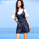 珮姿2017夏季新款套装女 时尚镂空喇叭袖上衣加蓝色牛仔背带短裤