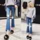 2016秋冬新款欧洲站显瘦膝盖破洞微喇叭修身牛仔裤女九分阔腿裤子