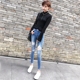 韩国春秋膝盖破洞牛仔裤女九分裤 小脚裤中腰弹力修身显瘦潮长裤